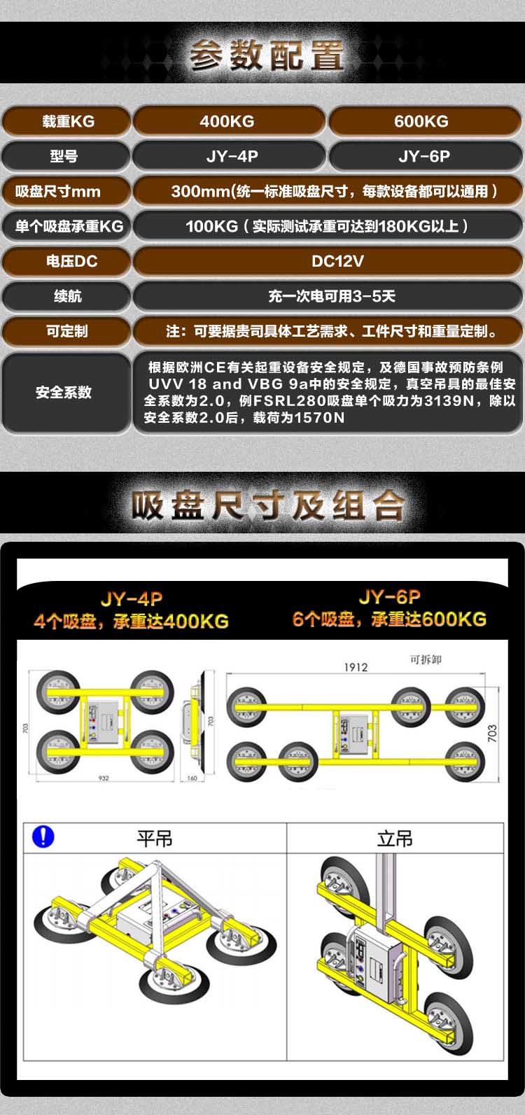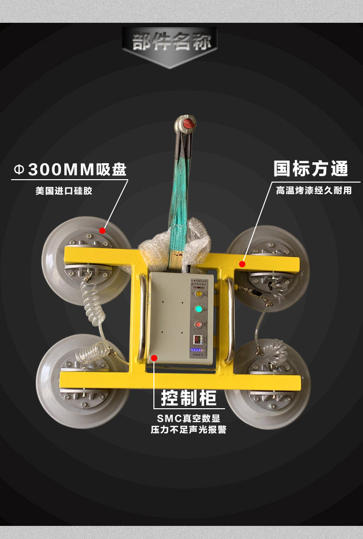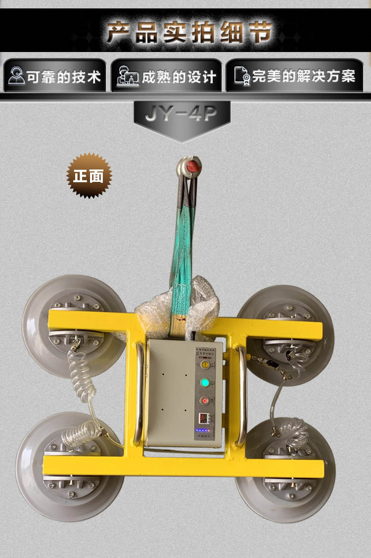 电瓶式吸吊机:动作为旋转360度,翻转90度。用于各类幕墙玻璃垂直或平面吸吊安装。适用于单元式幕墙、 全玻幕墙、隐框玻璃幕墙、明框玻璃幕墙、中空、夹层,钢化等幕墙玻璃吸吊安装。